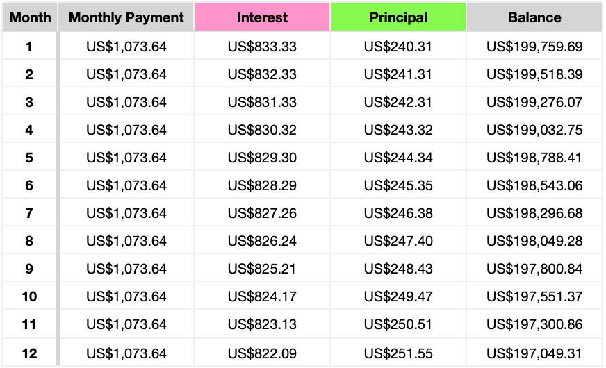 The amortization schedule as described by Investopedia is, a completed table of periodic loan payments, showing the amount of principle and the amount of interest that comprise each monthly repayment until the loan is paid off at the end of its term. Each monthly repayment is the same amount in total, thus the amounts of the principle and interest constituents vary dependent on the amount of outstanding loan left.