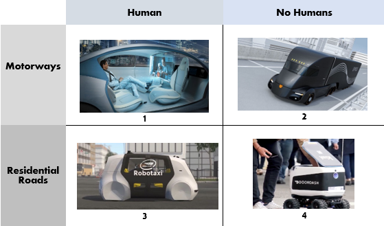 The 4 cases are: Commercial Vehicles owned by all (1), Long Distance Transportation Trucks (2), Robo-Taxis (3) and Food Delivery Services (4). These can all be visualised in a quadrant like so: