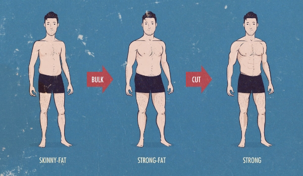 Whereas, starting with a "bulk" through a caloric surplus would result in a "strong fat" look, however due to the physical activity of weight training and eating an appropriate diet, a considerable amount of fat would be lost in the process. This would then be followed up by a brief cutting period - an ideal route to a beach body.